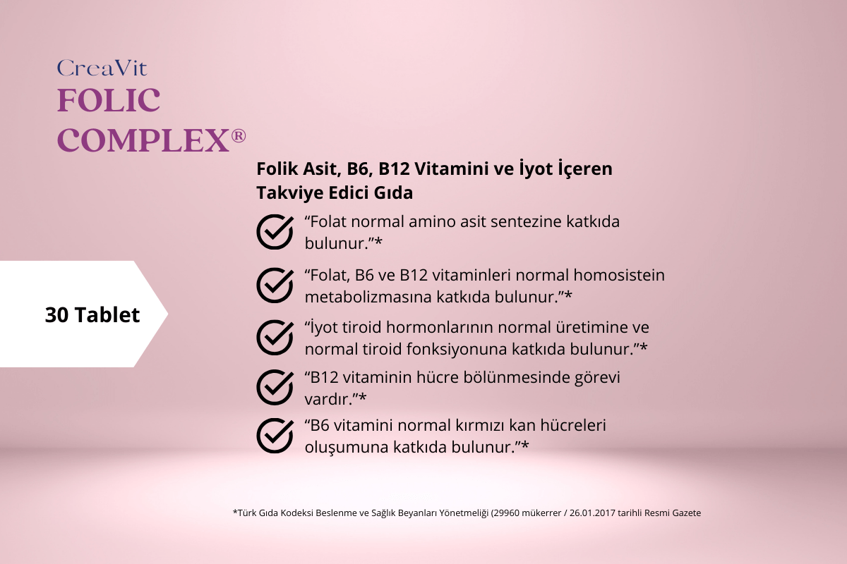 CreaVit® Folic Complex, özellikle hamilelik dönemi için Folik asit, Vitamin B6, Vitamin B12 ve İyot desteği sağlar;
