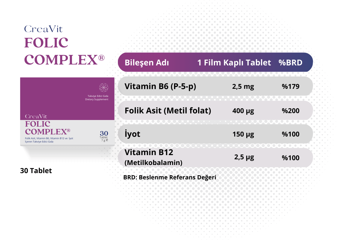 CreaVit® Folic Complex, özellikle hamilelik dönemi için Folik asit, Vitamin B6, Vitamin B12 ve İyot desteği sağlar;
