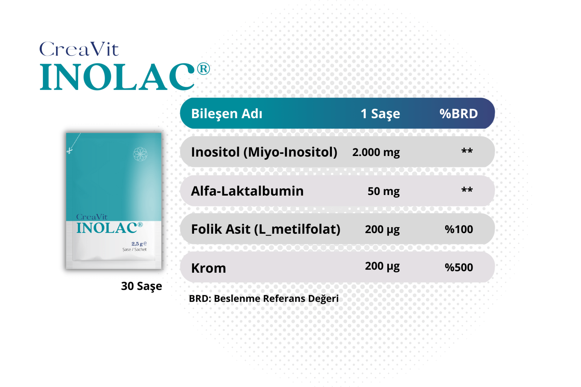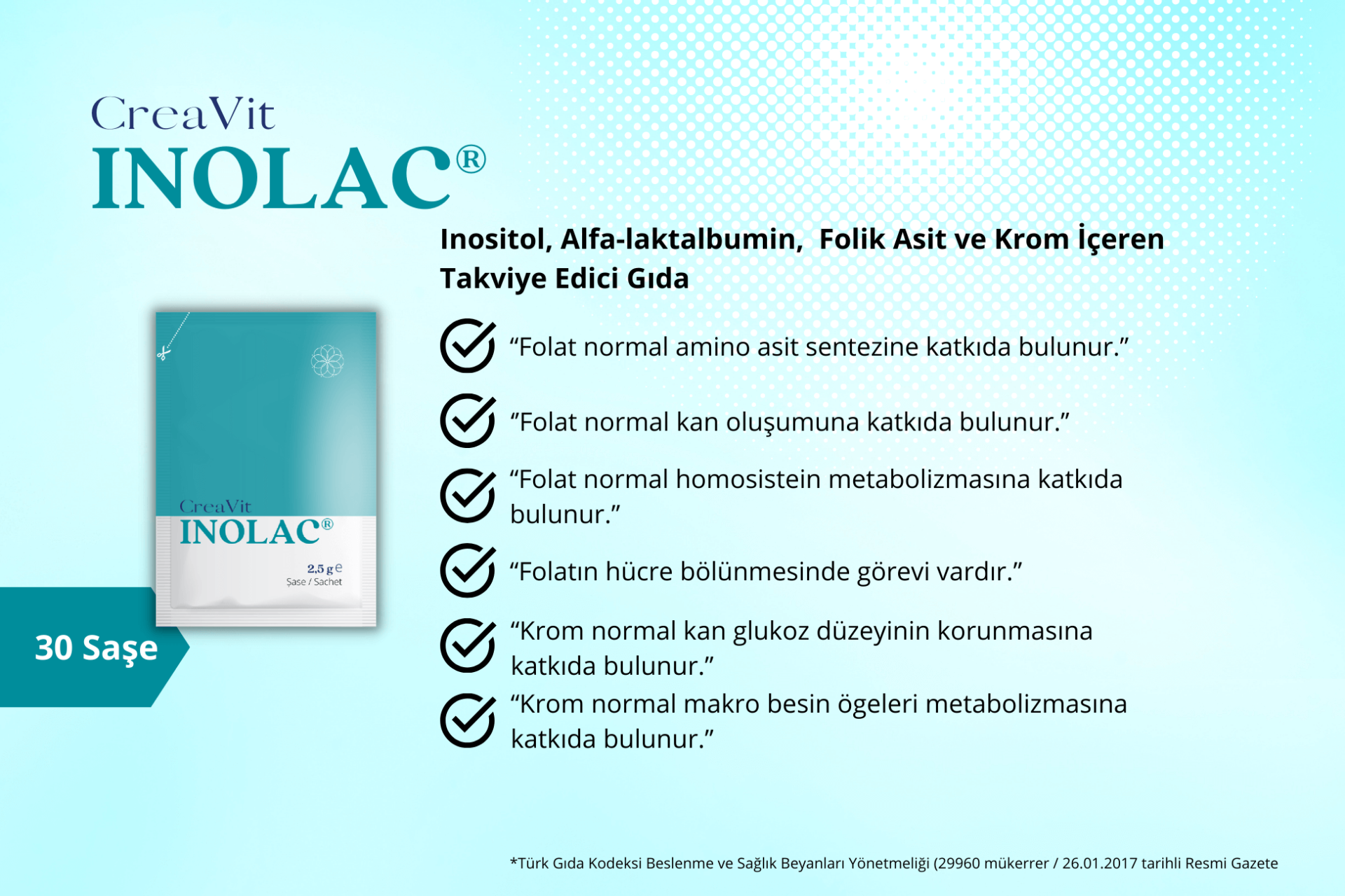 Inolac® miyo-inositol içeriği ile; kadınlarda sağlıklı hormon seviyelerinin dengelenmesini ve yumurtalık fonksiyonlarını destekler, menstrüel sağlığı destekleyerek düzensiz adet döngüsününün normalleşmesine destek olur, gebe kalmaya çalışan kadınlarda sağlıklı yumurta kalitesini destekler.