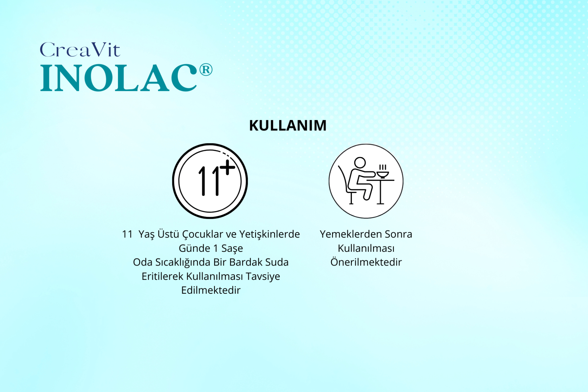 Bir kutu Inolac®, bir aylık doz olan 30 saşe içermektedir. 11 yaş üstü ve yetişkinler için önerilen günlük kullanım dozu 1 saşedir.
