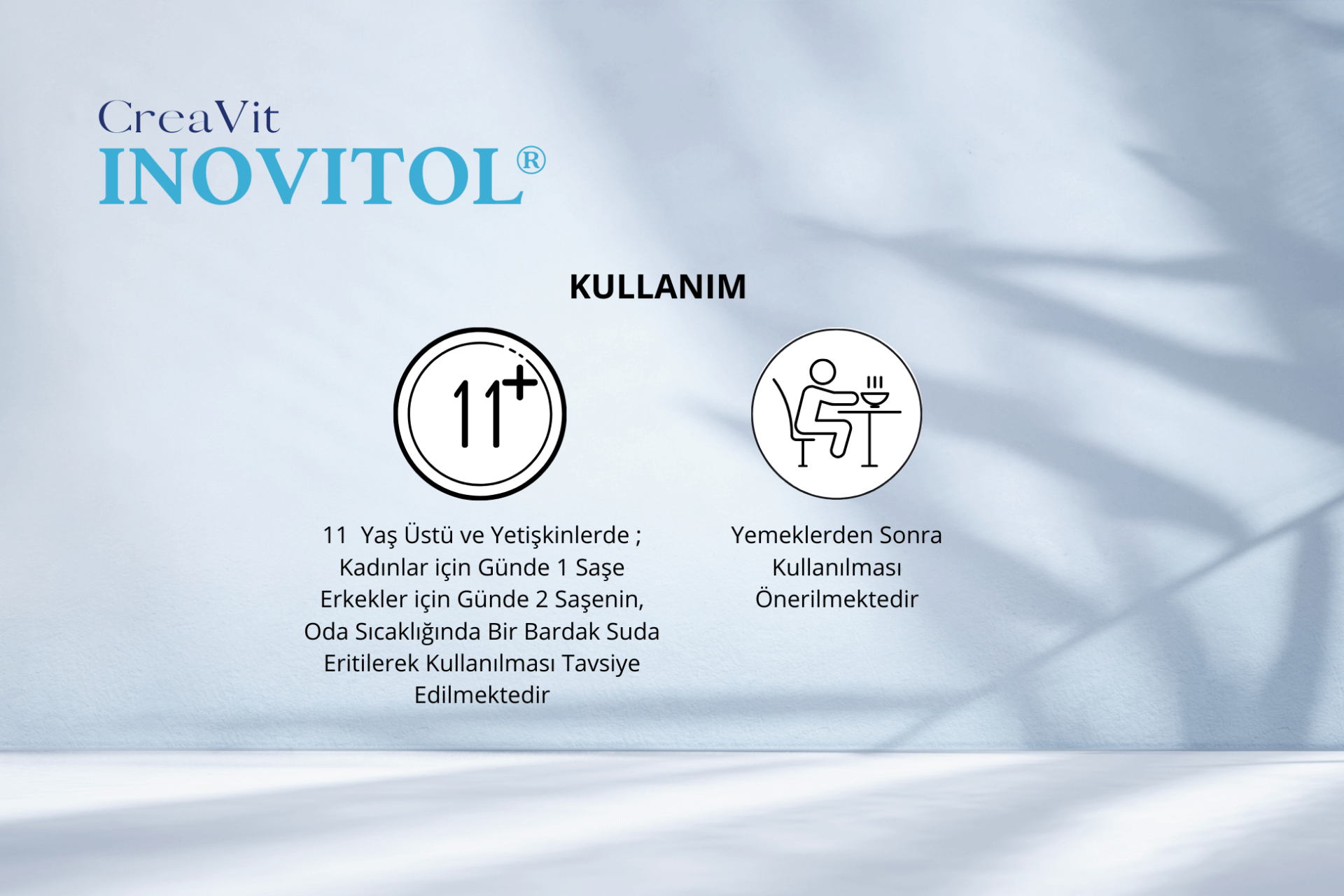 Bir kutu Inovitol®, 30 saşe içermektedir. 11 yaş üstü ve yetişkinler için önerilen günlük kullanım dozu ihtiyaca göre günde 1 ya da 2 saşedir.