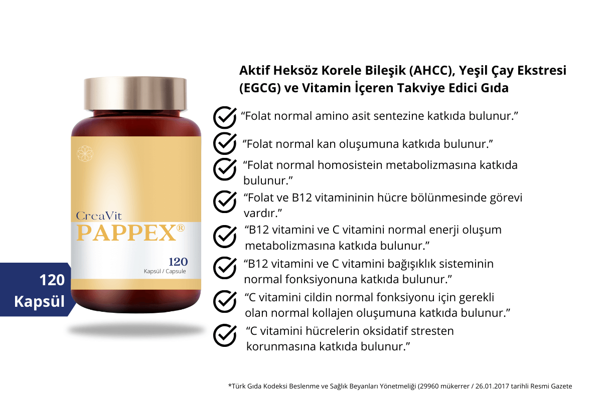 Pappex®; Active Hexose Correlated Compound (Aktif Heksoz Korele Bileşik), EGCG (Epigallokateşin galat), Folik asit (L-metilfolat), Vitamin C ve Vitamin B12 içeren, kadın ve erkeklerin kullanımı için, HPV tedavi sürecinde bağışıklık sistemini yükselterek tedaviye destek olmak amacı ile bilimsel verilerle özel olarak hazırlanmıştır.