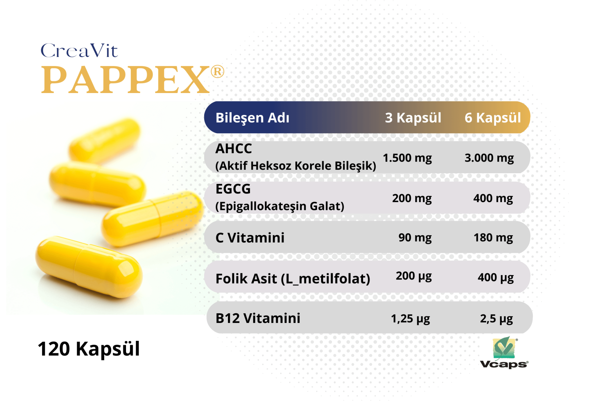 Pappex®; Active Hexose Correlated Compound (Aktif Heksoz Korele Bileşik), EGCG (Epigallokateşin galat), Folik asit (L-metilfolat), Vitamin C ve Vitamin B12 içeren, kadın ve erkeklerin kullanımı için, HPV tedavi sürecinde bağışıklık sistemini yükselterek tedaviye destek olmak amacı ile bilimsel verilerle özel olarak hazırlanmıştır.
