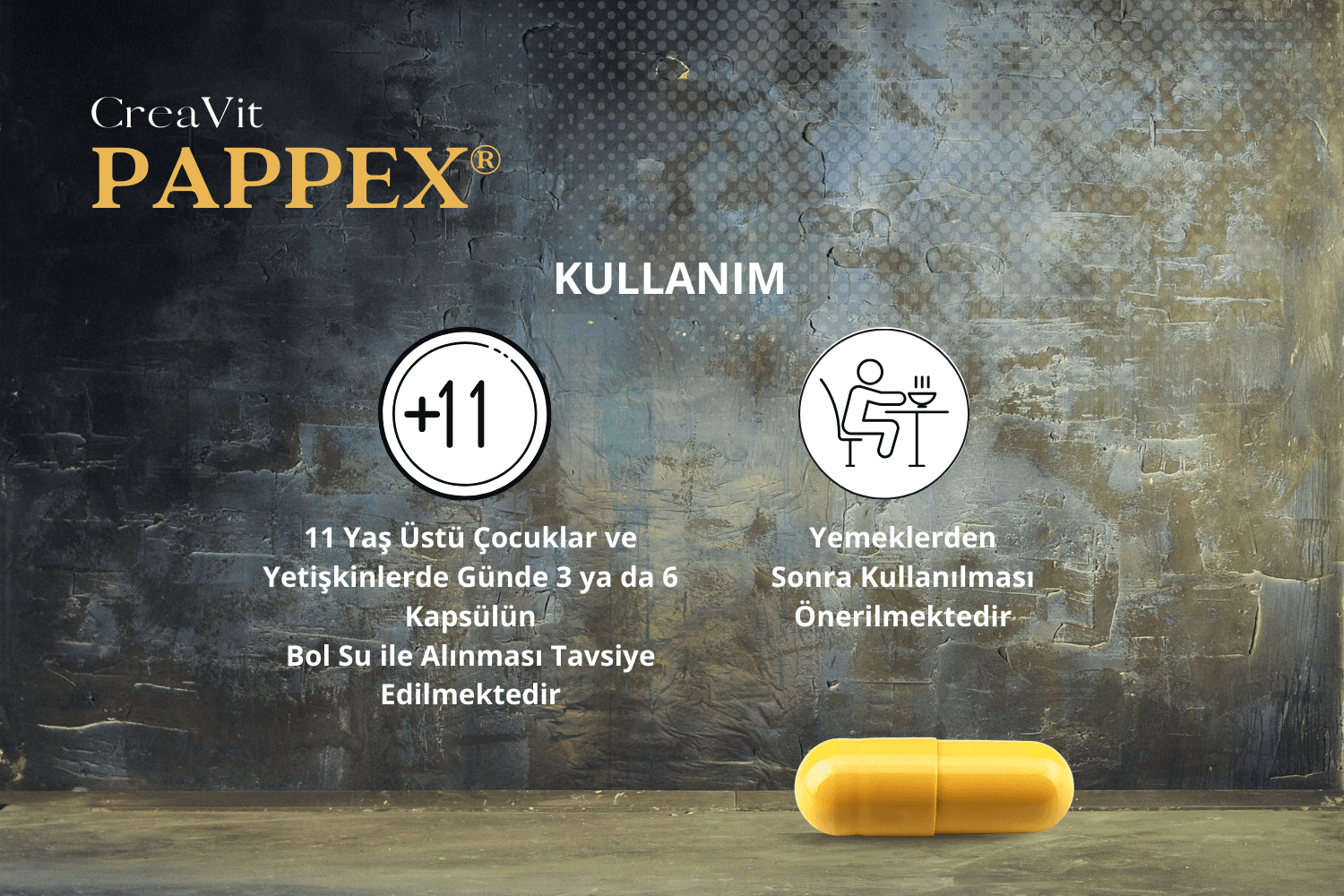 Bir kutu Pappex®, 120 kapsül içermektedir. 11 yaş üstü ve yetişkinler için önerilen günlük kullanım dozu ihtiyaca göre günde 3 ya da 6 kapsüldür. Pappex®’de titanyum dioksit içermeyen patentli bitkisel Vcaps kapsüller kullanılmıştır.
