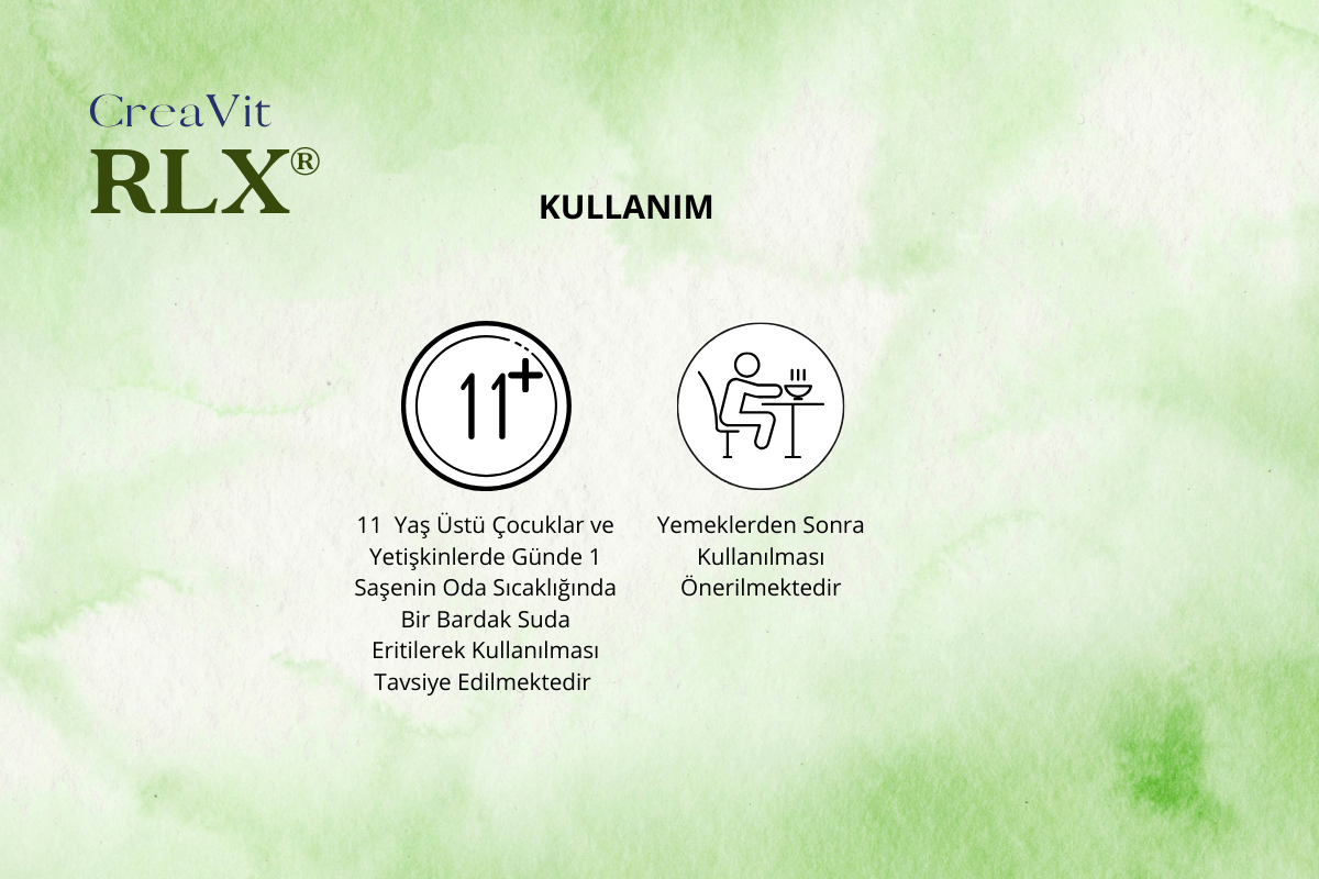 CreaVit® RLX Magnezyum Sitrat ve B6 Vitamini İçeren Takviye Edici Gıda; içeriğindeki B6 vitamini ile güçlendirilmiş Magnezyum Sitrat ile;